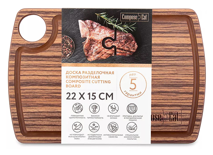 Разделочная доска ComposeEat DRJ22150654KL6 выполнена из бумажного композитного материала, сохраняющего целостность при падении, ударах и механической нагрузке, устойчивого к резким перепадам температур, не подверженному деформации, выцветанию, сколам, трещинам и механическим повреждениям. Модель оснащена желобом для слива жидкости и отверстием для подвешивания. Особенности: