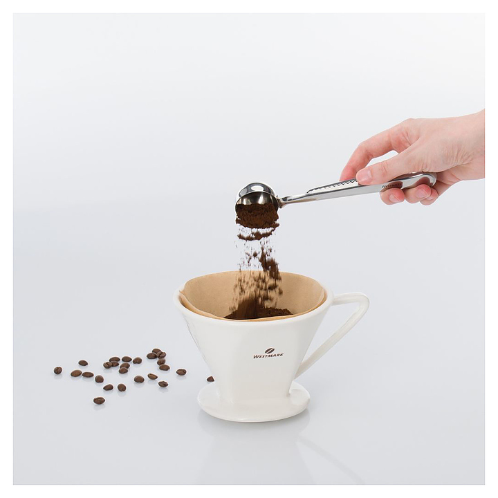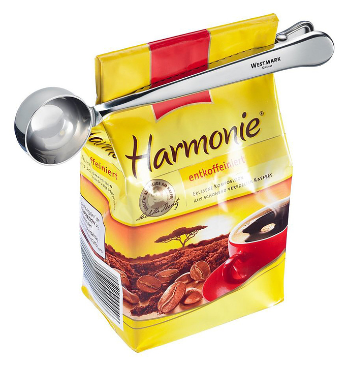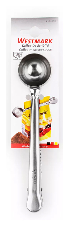Мерная ложка Westmark 15382270 предназначена для дозирования молотого кофе и чая на предприятиях общественного питания и торговли, а также в частных домах и квартирах. Модель оснащена зажимом для пакетов, позволяющим сохранить аромат кофе или чая. Изделие выполнено из нержавеющей стали. Дополнительные характеристики:
