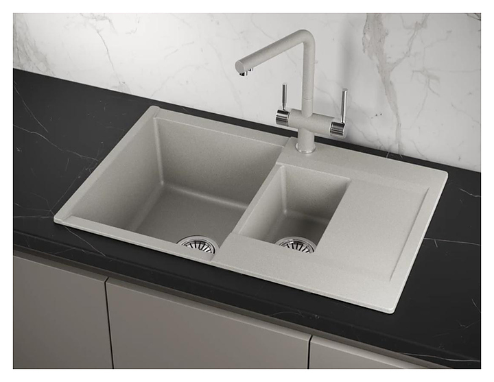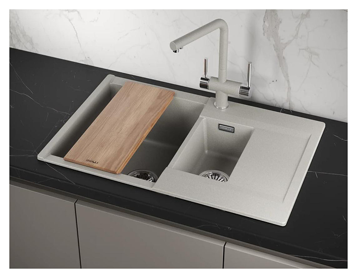 Мойка ESTETICA 7808 предназначена для рационального планирования рабочего места на кухне. Вместительная чаша большого размера и небольшая дополнительная чаша расположены параллельно друг другу. Крыло-сушилка служит подставкой для посуды и продуктов, возможна установка измельчителя. Изделие выполнено из кварца, который отличается способностью поглощать шум воды, стойкостью к действию моющих средств, экологичностью и долговечностью, разделочная доска - из ясеня. В комплект поставки входят слив-перелив, сифон и разделочная доска. Дополнительные характеристики: