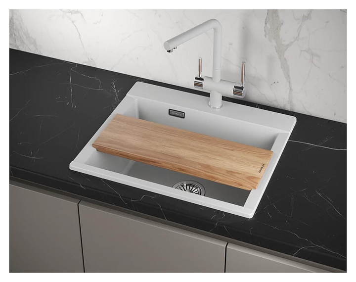 Мойка ESTETICA 5804 предназначена для рационального планирования рабочего места на кухне. Широкая задняя поверхность предназначена для установки смесителя и размещения аксессуаров. Изделие выполнено из кварца, который отличается способностью поглощать шум воды, стойкостью к действию моющих средств, экологичностью и долговечностью, разделочная доска - из ясеня. В комплект поставки входят слив-перелив, сифон и разделочная доска. Дополнительные характеристики: