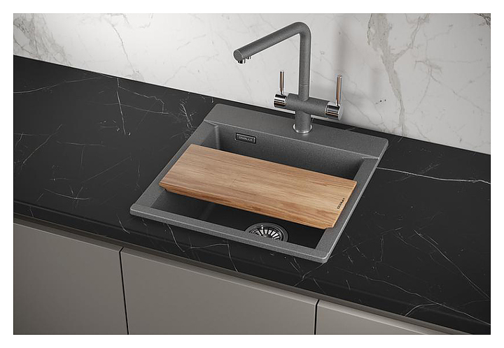 Мойка ESTETICA 4701 предназначена для рационального планирования рабочего места на кухне. Широкая задняя поверхность предназначена для размещения смесителя и аксессуаров. Модель подходит для установки кухонных измельчителей. Изделие выполнено из кварца, который отличается способностью поглощать шум воды, стойкостью к действию моющих средств, экологичностью и долговечностью, разделочная доска - из ясеня. В комплект поставки входят слив-перелив, сифон и разделочная доска. Дополнительные характеристики: