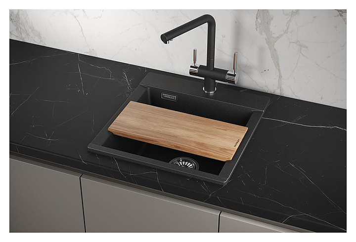 Мойка ESTETICA 4701 предназначена для рационального планирования рабочего места на кухне. Широкая задняя поверхность предназначена для размещения смесителя и аксессуаров. Модель подходит для установки кухонных измельчителей. Изделие выполнено из кварца, который отличается способностью поглощать шум воды, стойкостью к действию моющих средств, экологичностью и долговечностью, разделочная доска - из ясеня. В комплект поставки входят слив-перелив, сифон и разделочная доска. Дополнительные характеристики: