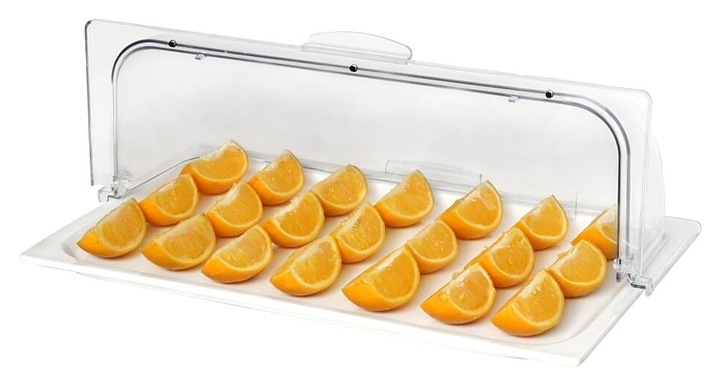 Поднос Sunnex X88183 используется на предприятиях общественного питания а также в домашних условиях в процессе сервировки шведского стола для выкладки различных продуктов. Модель оснащена лотком формата GN1/1 и куполом с откидной крышкой. Лоток выполнен из белого фарфора, купол и крышка – из ударопрочного прозрачного пластика. Дополнительные характеристики: