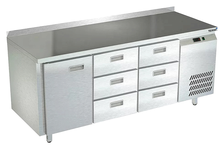 Морозильный стол Техно-ТТ СПБ/М-222/16-1807 предназначен для раскатки теста, обработки, заморозки и долговременного хранения продуктов, полуфабрикатов, напитков и мороженого на предприятиях общественного питания и торговли. Модель оснащена 1 секцией с дверью и регулируемой полкой-решеткой, 2 секциями с 6 ящиками, направляющими с доводчиками (Австрия), петлями-доводчиками (Польша), бортом и круглыми ножками, регулируемыми по высоте на 50 мм (Италия). Корпус и столешница выполнены из нержавеющей стали AISI 430, задняя стенка и дно - из оцинкованной стали. Стол поставляется в собранном виде. Особенности: