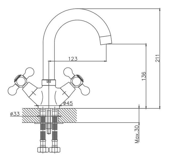 Смеситель Cron CN1319 предназначен для подачи горячей и холодной воды в кухонных помещениях. Модель оснащена вентилями и керамической кран-буксой, которая обеспечивает бесшумное смешивание воды. Аэратор создает мягкую струю без брызг. Изделие выполнено из металлического сплава, который отличается прочностью и долговечностью. В комплект поставки входит подводка. Дополнительные характеристики: