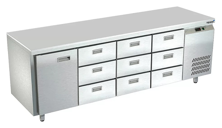 Морозильный стол Техно-ТТ СПБ/М-522/19-2206 предназначен для раскатки теста, обработки, заморозки и долговременного хранения продуктов, полуфабрикатов, напитков и мороженого на предприятиях общественного питания и торговли. Модель оснащена 1 секцией с дверью и регулируемой полкой-решеткой, 2 секциями с 9 ящиками, направляющими с доводчиками (Австрия), петлями-доводчиками (Польша) и круглыми ножками, регулируемыми по высоте на 50 мм (Италия). Корпус выполнен из нержавеющей стали AISI 430, задняя стенка и дно - из оцинкованной стали, столешница - из полипропилена. Стол поставляется в собранном виде. Особенности: