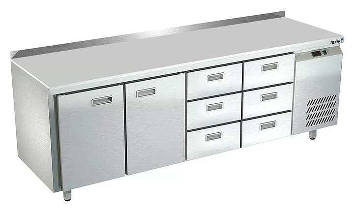 Морозильный стол Техно-ТТ СПБ/М-622/26-2207 предназначен для раскатки теста, обработки, заморозки и долговременного хранения продуктов, полуфабрикатов, напитков и мороженого на предприятиях общественного питания и торговли. Модель оснащена 2 секциями с 2 дверьми и регулируемой полкой-решеткой, 2 секциями с 6 ящиками, направляющими с доводчиками (Австрия), петлями-доводчиками (Польша), бортом и круглыми ножками, регулируемыми по высоте на 50 мм (Италия). Корпус выполнен из нержавеющей стали AISI 430, задняя стенка и дно - из оцинкованной стали, столешница - из полипропилена. Стол поставляется в собранном виде. Особенности: