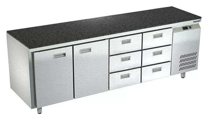 Морозильный стол Техно-ТТ СПБ/М-322/26-2206 предназначен для раскатки теста, обработки, заморозки и долговременного хранения продуктов, полуфабрикатов, напитков и мороженого на предприятиях общественного питания и торговли. Модель оснащена 2 секциями с 2 дверьми и регулируемой полкой-решеткой, 2 секциями с 6 ящиками, направляющими с доводчиками (Австрия), петлями-доводчиками (Польша) и круглыми ножками, регулируемыми по высоте на 50 мм (Италия). Корпус выполнен из нержавеющей стали AISI 430, задняя стенка и дно - из оцинкованной стали, столешница - из камня. Стол поставляется в собранном виде. Особенности: