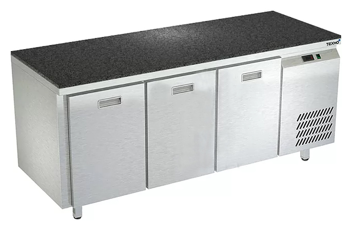 Морозильный стол Техно-ТТ СПБ/М-323/03-1807 предназначен для раскатки теста, обработки, заморозки и долговременного хранения продуктов, полуфабрикатов, напитков и мороженого на предприятиях общественного питания и торговли. Модель оснащена 3 секциями с 3 ящиками, направляющими с доводчиками (Австрия) и круглыми ножками, регулируемыми по высоте на 50 мм (Италия). Корпус выполнен из нержавеющей стали AISI 430, задняя стенка и дно - из оцинкованной стали, столешница - из камня. Стол поставляется в собранном виде. Особенности: