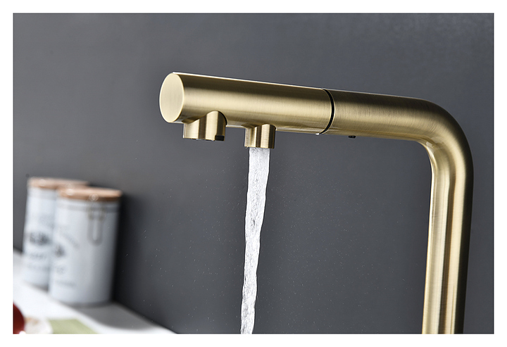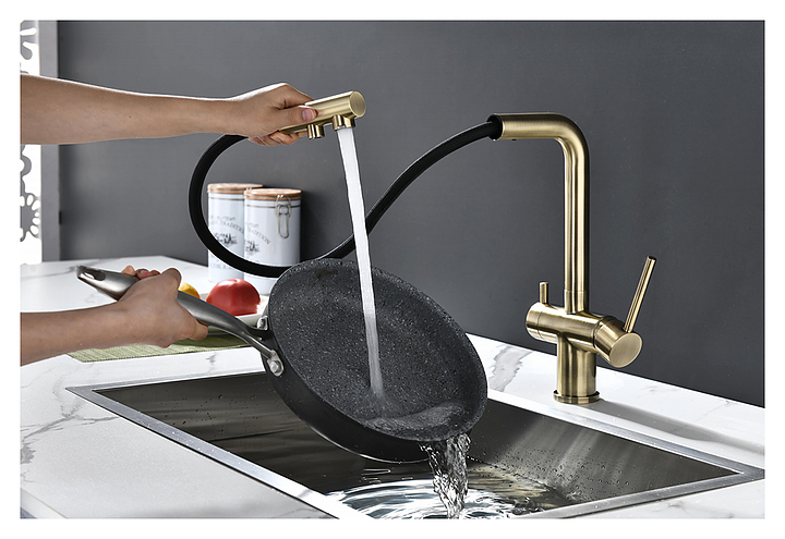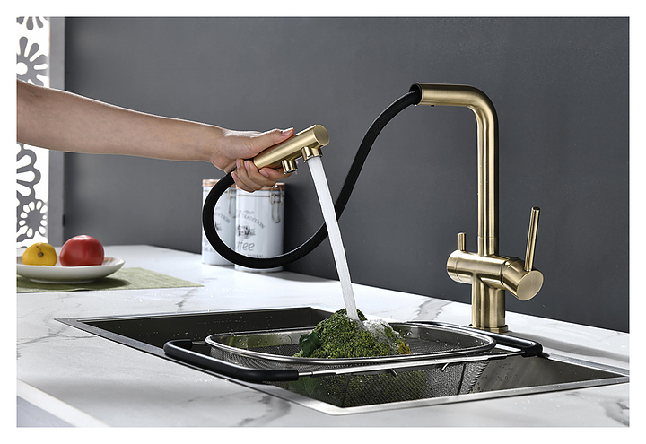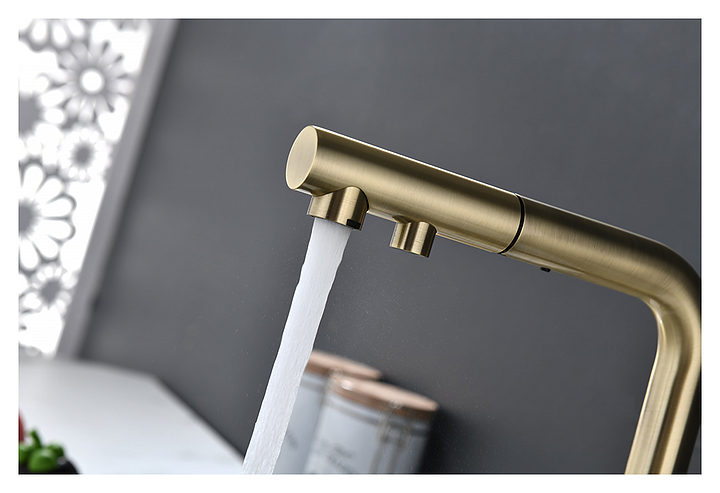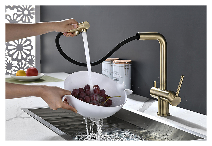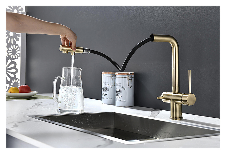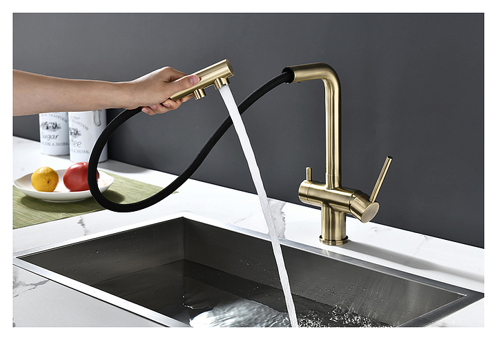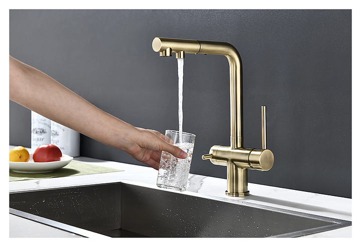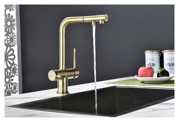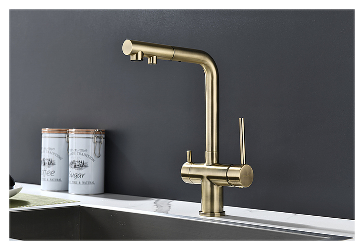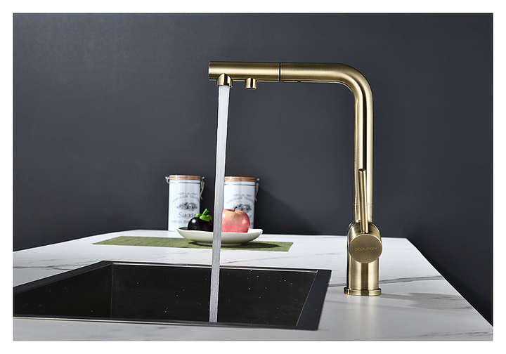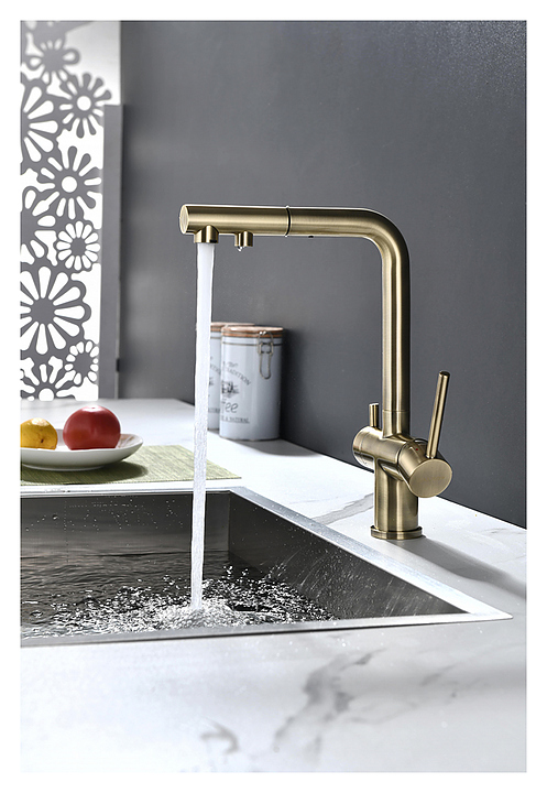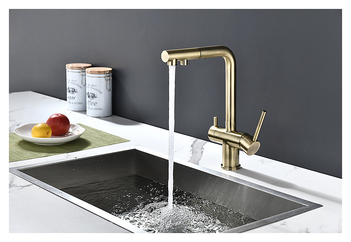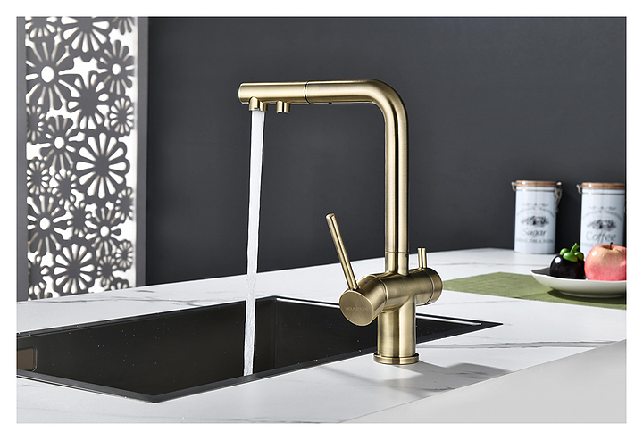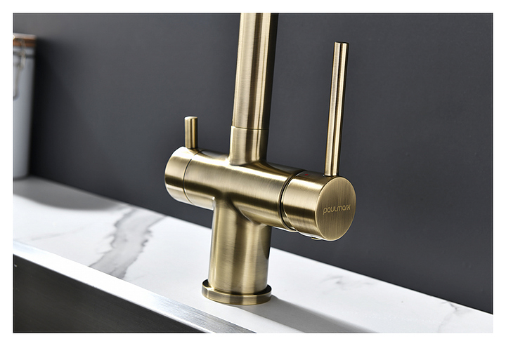 Смеситель Paulmark Serpentine Se213222-BR предназначен для подачи горячей и холодной воды в кухонных помещениях. Модель оснащена вытяжным изливом, каналом для фильтрованной воды и керамическим картриджем, обеспечивающим плавный ход рычага смесителя, контроль и точность при выборе напора и температуры воды. Смеситель монтируется с помощью гайки. Изделие выполнено из латуни, отличающейся прочностью, долговечностью и устойчивостью к перепадам температуры. Дополнительные характеристики: