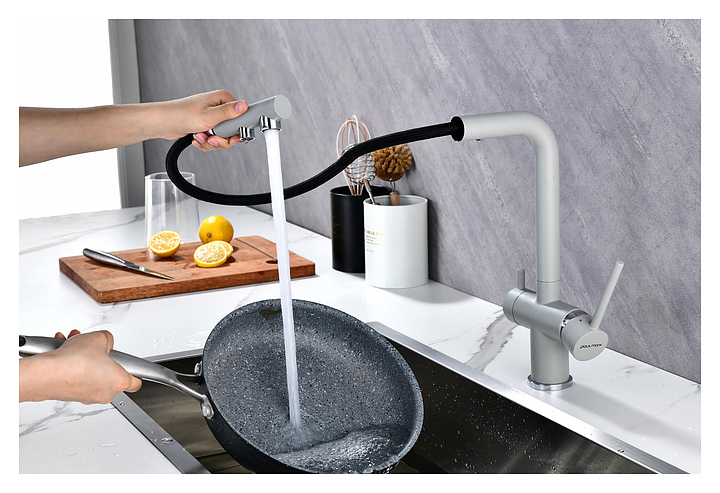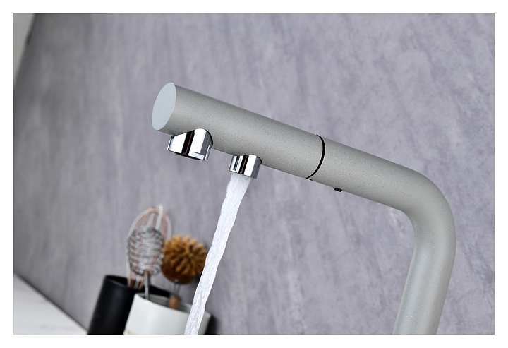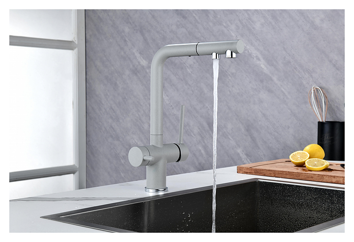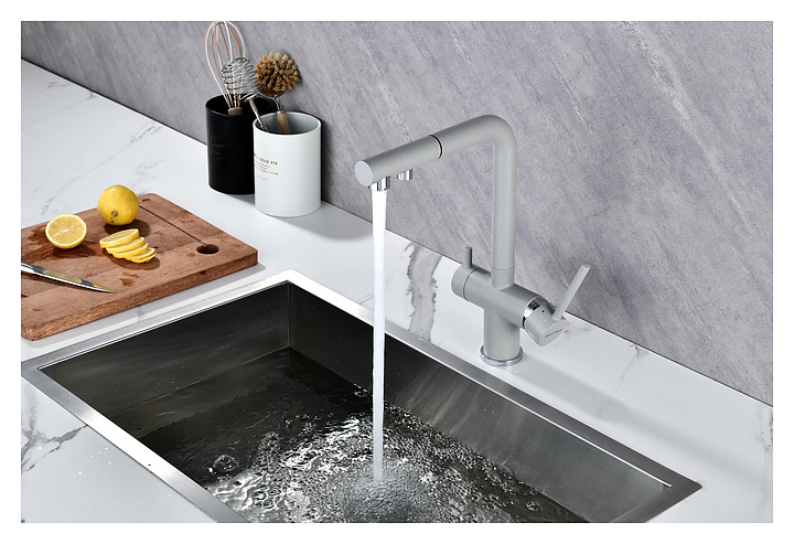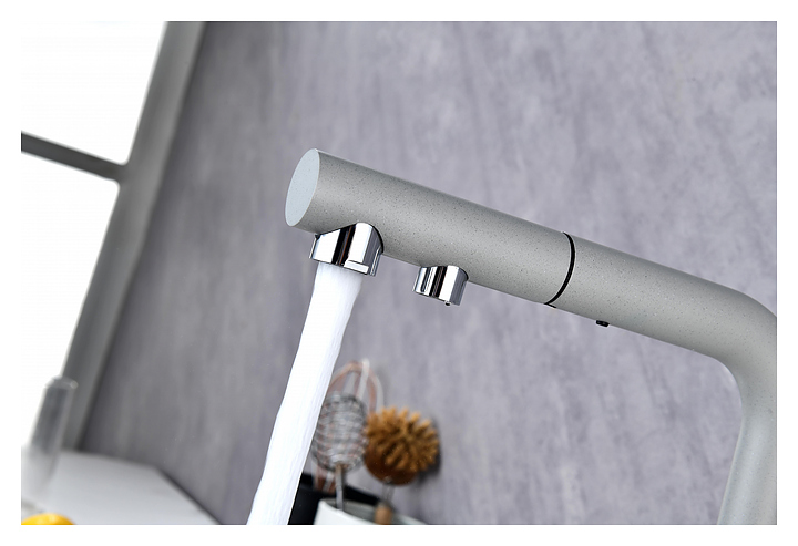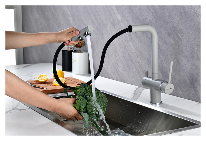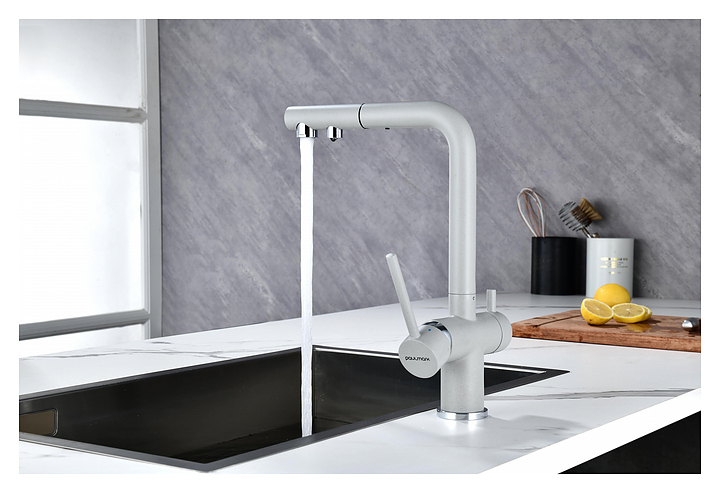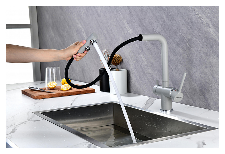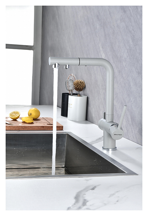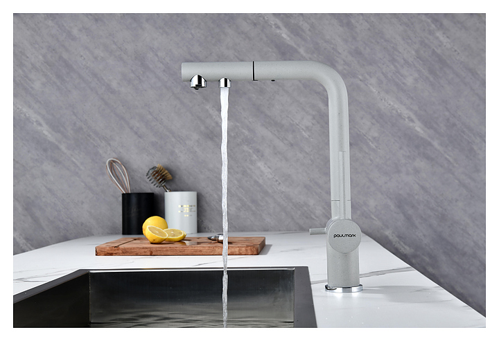 Смеситель Paulmark Serpentine Se213222-GRS предназначен для подачи горячей и холодной воды в кухонных помещениях. Модель оснащена вытяжным изливом, каналом для фильтрованной воды и керамическим картриджем, обеспечивающим плавный ход рычага смесителя, контроль и точность при выборе напора и температуры воды. Смеситель монтируется с помощью гайки. Изделие выполнено из латуни, отличающейся прочностью, долговечностью и устойчивостью к перепадам температуры. Дополнительные характеристики: