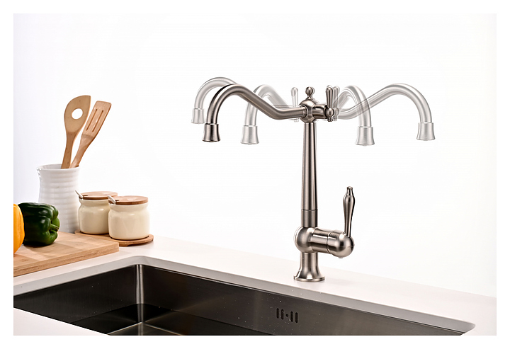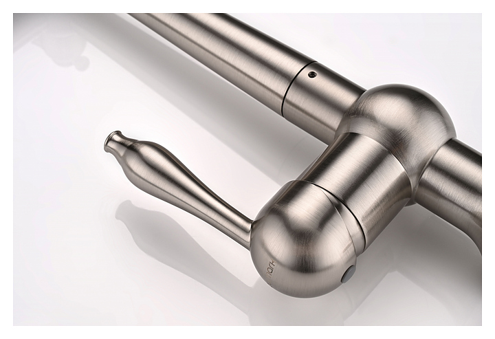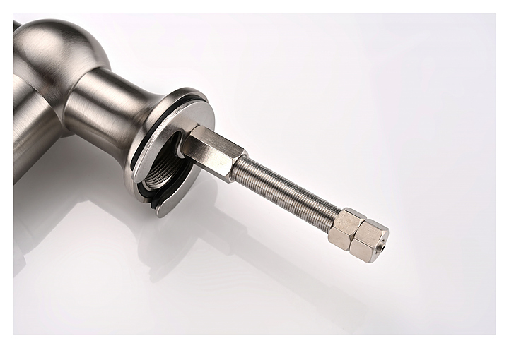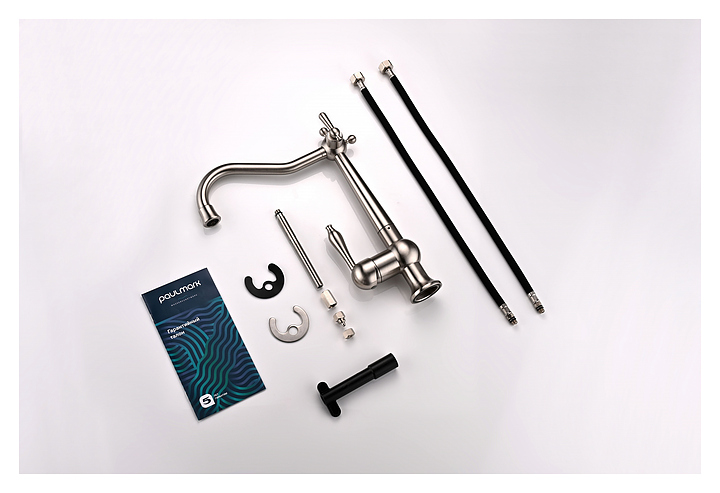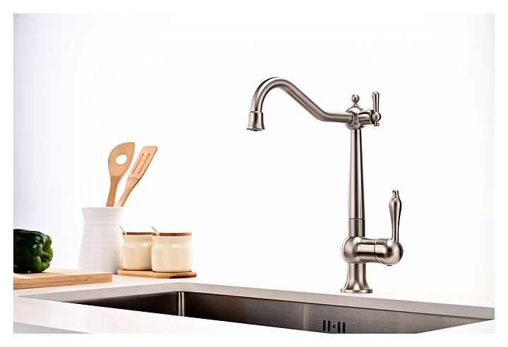 Смеситель Paulmark Retro Re213226-NI предназначен для подачи горячей и холодной воды в кухонных помещениях. Модель имеет совмещенный излив для фильтра и аэратор, который экономит расход воды, уменьшает шум и снижает количество брызг. Керамический картридж обеспечивает плавный ход рычага смесителя, контроль и точность при выборе напора и температуры воды. Изделие выполнено из латуни, отличающейся прочностью, долговечностью и устойчивостью к перепадам температур. В комплект поставки входят гибкая подводка, гайки и крепления. Дополнительные характеристики: