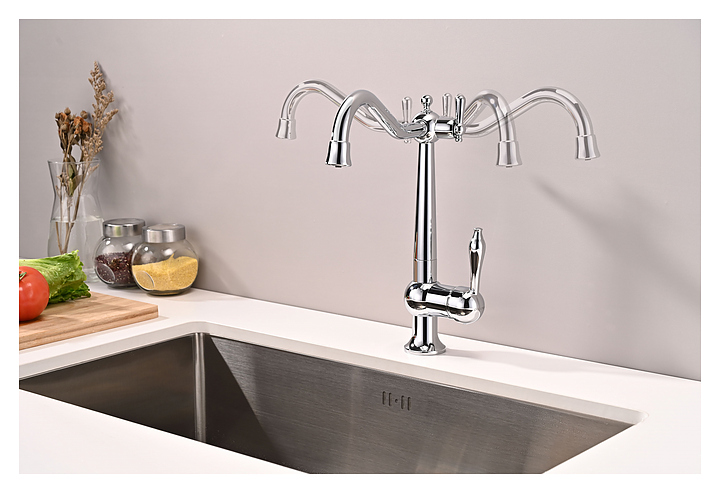 Смеситель Paulmark Retro Re213226-CR предназначен для подачи горячей и холодной воды в кухонных помещениях. Модель имеет совмещенный излив для фильтра и аэратор, который экономит расход воды, уменьшает шум и снижает количество брызг. Керамический картридж обеспечивает плавный ход рычага смесителя, контроль и точность при выборе напора и температуры воды. Изделие выполнено из латуни, отличающейся прочностью, долговечностью и устойчивостью к перепадам температур. В комплект поставки входят гибкая подводка, гайки и крепления. Дополнительные характеристики: