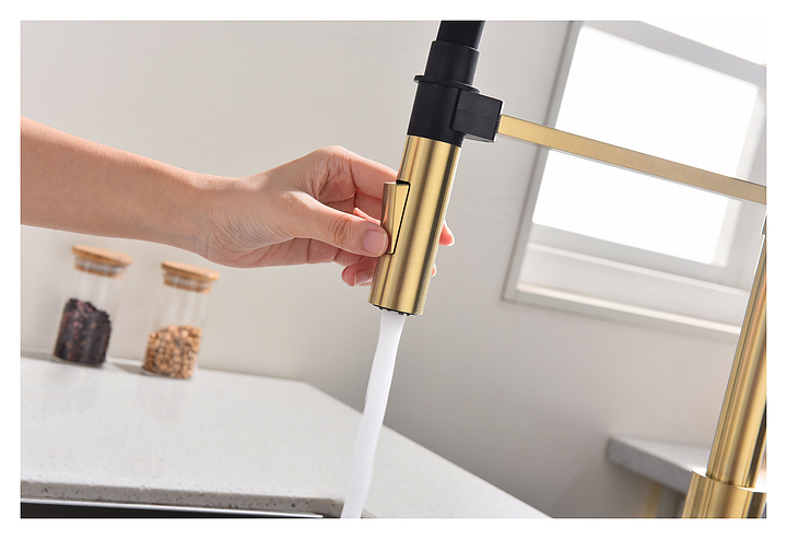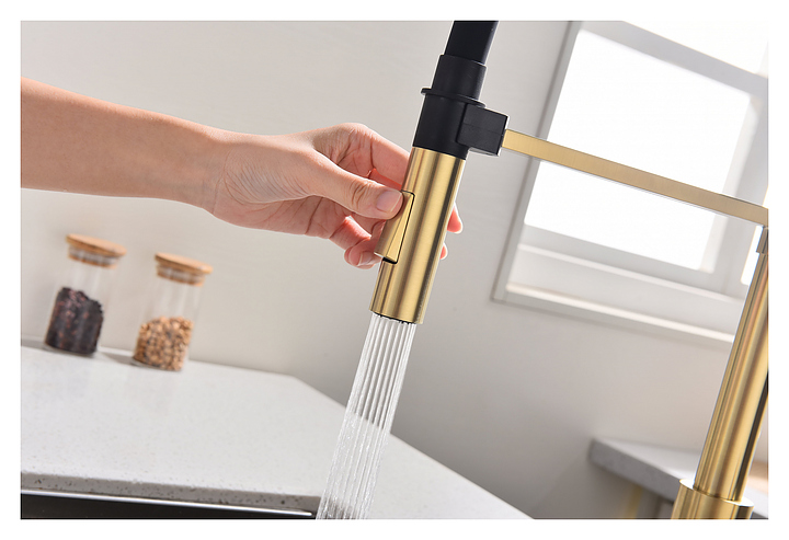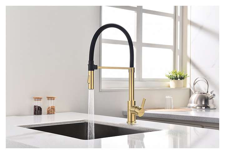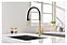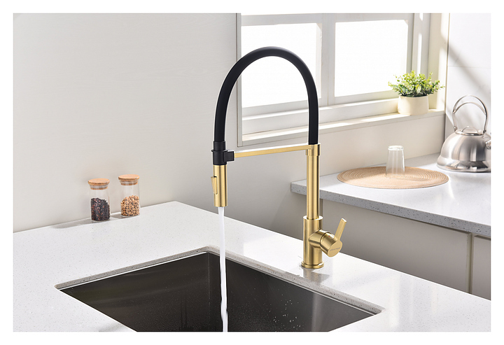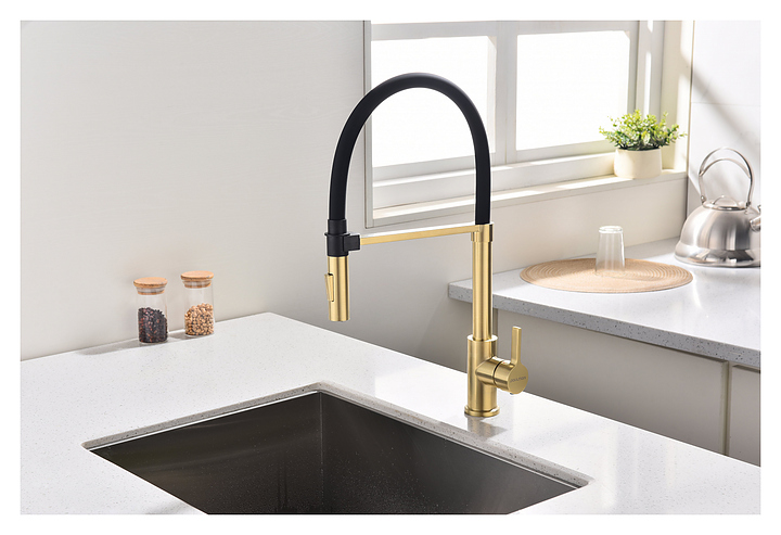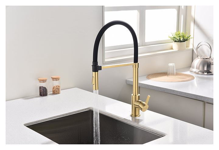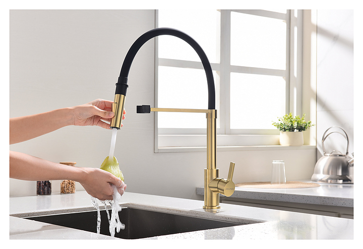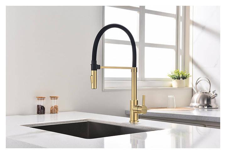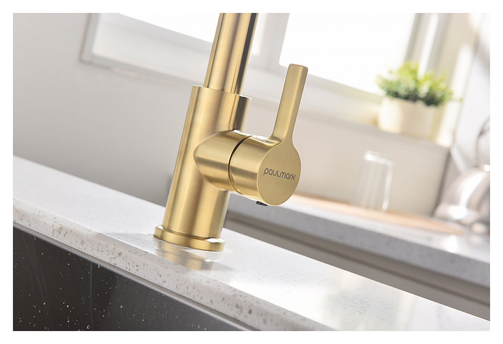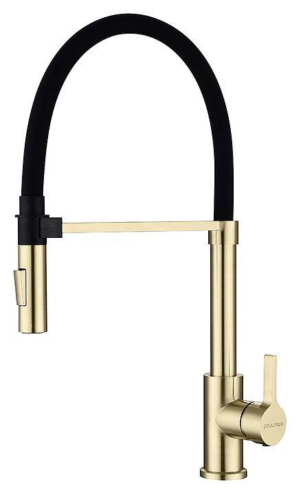 Смеситель Paulmark Halt Ha214021-SBG предназначен для подачи горячей и холодной воды в кухонных помещениях. Модель оснащена гибким изливом с магнитным держателем и керамическим картриджем, который обеспечивает плавный ход рычага смесителя, контроль и точность при выборе напора и температуры воды. Изделие выполнено из латуни, отличающейся прочностью, долговечностью и устойчивостью к перепадам температур, излив - из силикона, подводка - из нержавеющей стали. В комплект поставки входят гибкая подводка и крепления. Дополнительные характеристики: