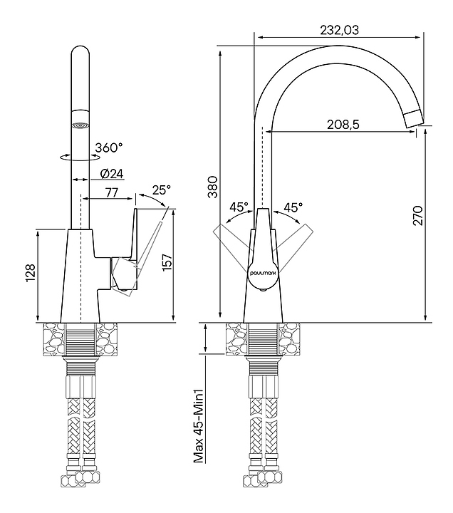 Смеситель Paulmark Holstein Ho212065-307 предназначен для подачи горячей и холодной воды в кухонных помещениях. Модель оснащена аэратором, который уменьшает шум и снижает количество брызг. Керамический картридж обеспечивает плавный ход рычага смесителя, контроль и точность при выборе напора и температуры воды. Изделие выполнено из латуни, отличающейся прочностью, долговечностью и устойчивостью к перепадам температур. В комплект поставки входят крепления, аэратор и гибкая подводка. Дополнительные характеристики: