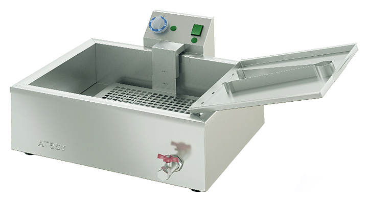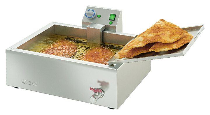 Фритюрница ATESY Чебуречница-мини М используется на предприятиях общественного питания и торговли для приготовления чебуреков, пирожков и беляшей в разогретом масле (фритюре). Модель оснащена терморегулятором и 2 индикаторными лампами. Изделие полностью выполнено из пищевой нержавеющей стали. В комплект поставки входит кулинарный пинцет для переворачивания и выкладки чебуреков. Особенности: