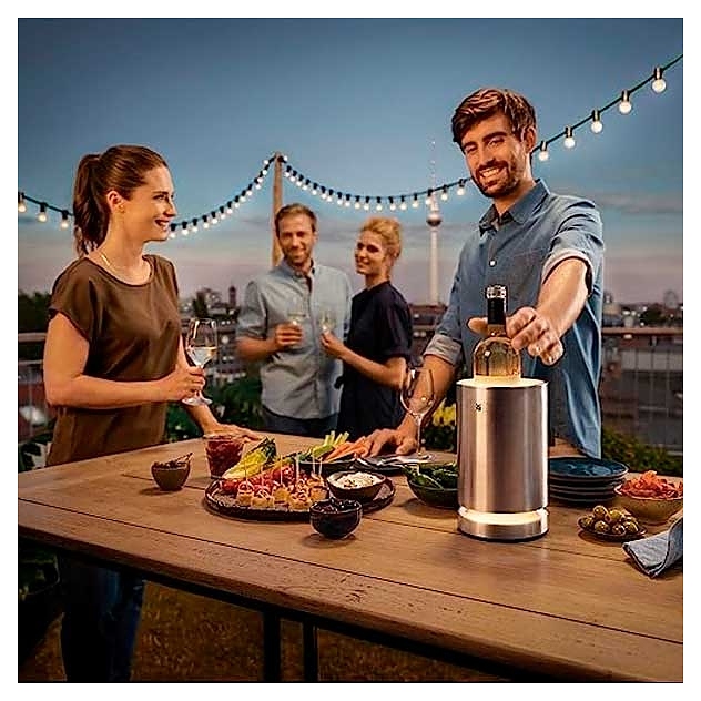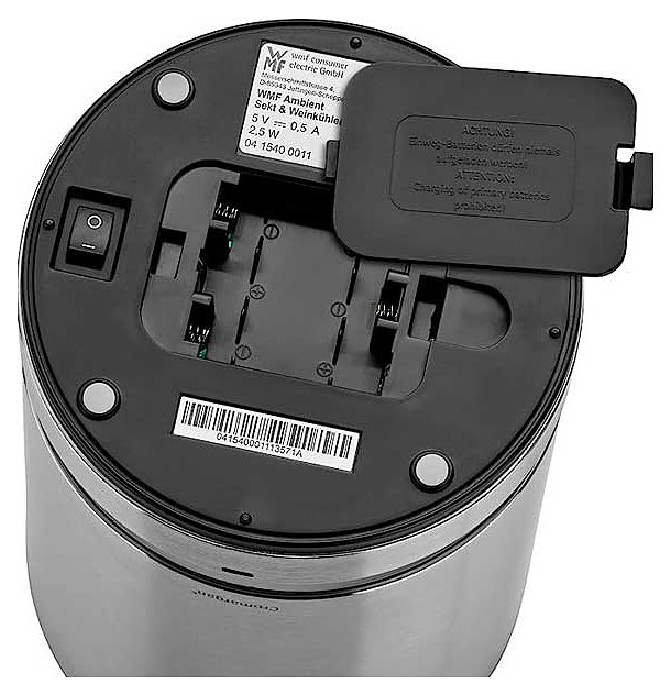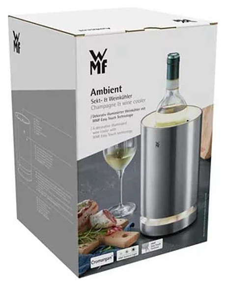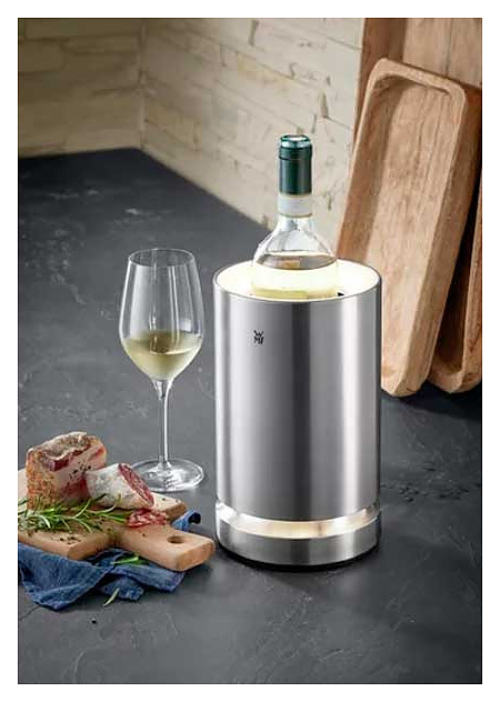 Кулер WMF Ambient 04.1540.0011 предназначен для поддержания заданной температуры бутылок вина в рамках одного температурного режима в ресторанах, специализированных магазинах, у буфета, барной стойки или стойки для продажи спиртных напитков, в отелях, в частных домах или квартирах. Модель оснащена декоративной светодиодной подсветкой вверху и внизу с 3 уровнями яркости, которая легко регулируется с помощью касания. Кулер также можно использовать как ведерко для льда. Охлаждающую манжету можно хранить в горизонтальном положении в отсеке для льда. В комплект поставки входят охладитель для бутылок с охлаждающей манжетой и 1-зарядный кабель с разъемом USB. Характеристики: