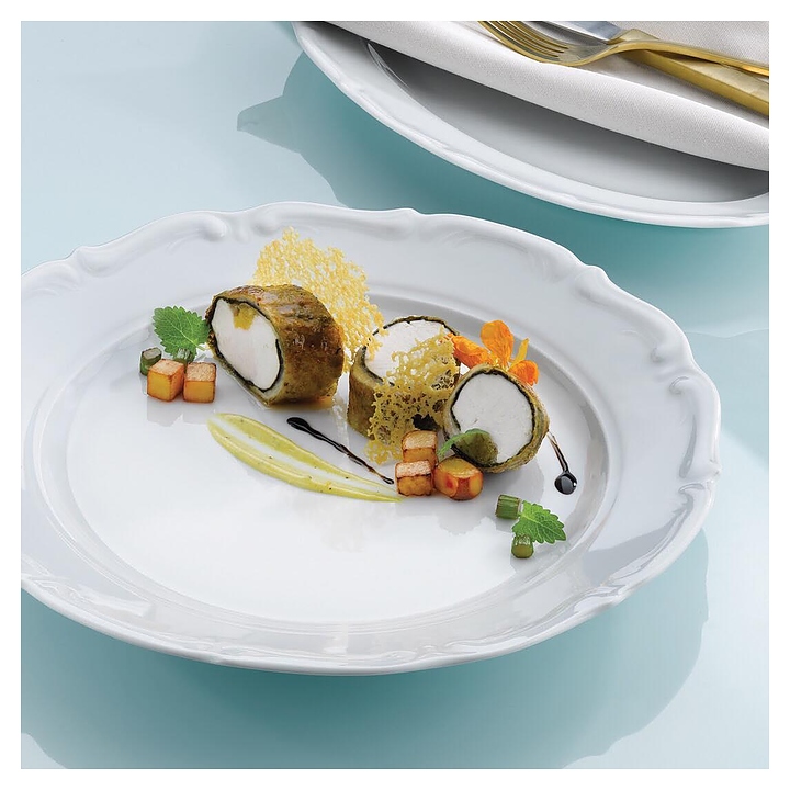 Овальное блюдо Porland 111927 серии Maria предназначено для профессионального использования на предприятиях общественного питания. Декор изделия отличается классическим дизайном с элегантным рельефным рисунком и отлично подойдет для создания изысканной атмосферы. Посуда изготавливается по запатентованной технологии Alumilite с добавлением оксида алюминия, что делает ее устойчивой к сколам, механическим и термическим воздействиям. Изделие выполнено из твердого фарфора и покрыто высококачественной тугоплавкой глазурью Feldspatic. Цена указана за 1 шт. Особенности: