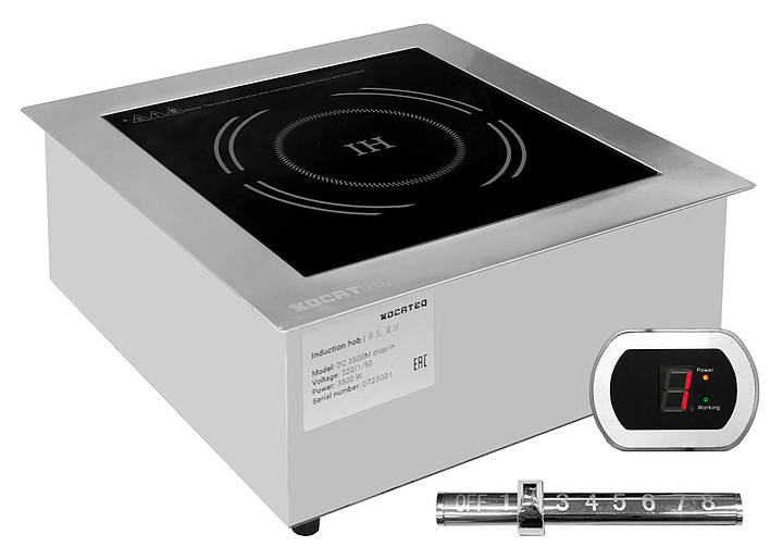 Встраиваемая индукционная плита Kocateq DC 3500M drop in предназначена для приготовления широкого спектра блюд в наплитной посуде на предприятиях общественного питания и торговли, в пекарнях и кондитерских. Модель оснащена простой в использовании панелью управления, состоящей из цифрового дисплея и 8-ступенчатого регулятора мощности с ползунком. Корпус выполнен из нержавеющей стали AISI 201. В комплект поставки входит воздушный фильтр. Дополнительные характеристики: