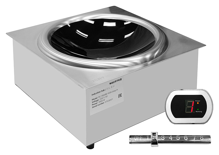 Встраиваемая индукционная плита Kocateq DC 5000M WOK drop in предназначена для приготовления широкого спектра блюд в наплитной посуде на предприятиях общественного питания и торговли, в пекарнях и кондитерских. Модель оснащена простой в использовании панелью управления, состоящей из цифрового дисплея и 8-ступенчатого регулятора мощности с ползунком. Корпус выполнен из нержавеющей стали AISI 201. В комплект поставки входит воздушный фильтр и сковорода Дополнительные характеристики: