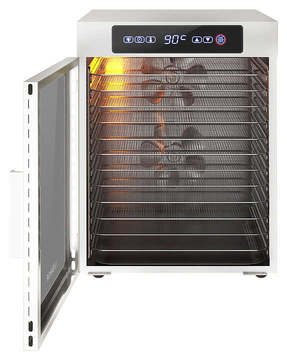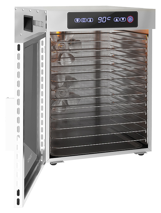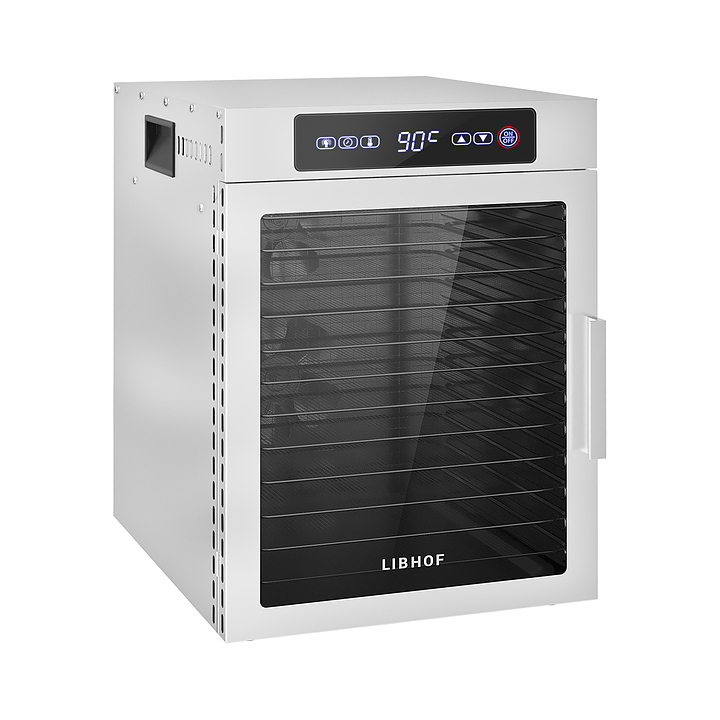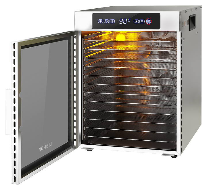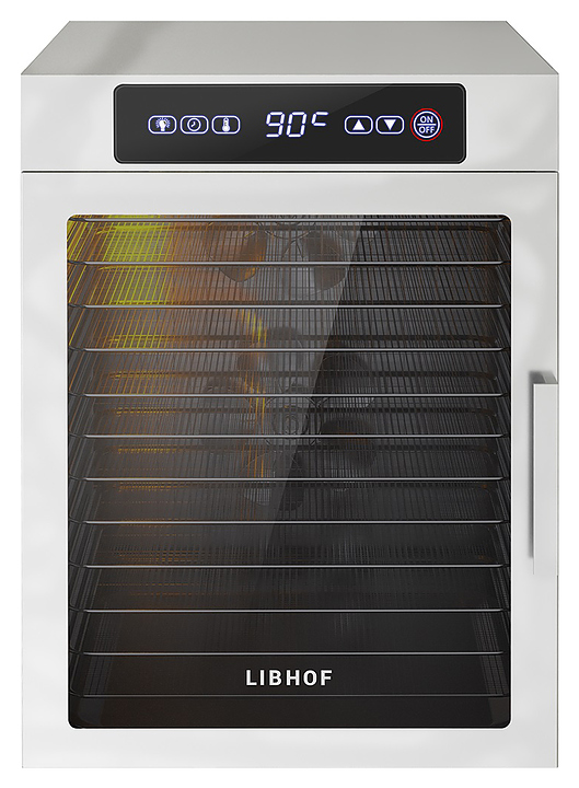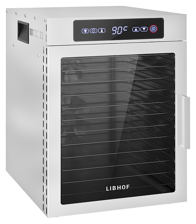 Дегидратор Libhof FDN-12 используется на предприятиях пищевой промышленности, общественного питания и торговли, а также в домашних условиях для сушки овощей, фруктов, ягод, грибов и трав, вяления рыбы, расстойки теста, приготовления сухариков, пастилы и йогурта. Модель оснащена камерой с 12 уровнями направляющих для размещения поддонов, расположенными в задней стенке вентилятором и нагревательными элементами, распашной дверью с вертикальной рукояткой, кабелем питания и цифровым дисплеем. Корпус и поддоны выполнены из высококачественной нержавеющей стали. В комплект поставки входят 12 съемных решетчатых поддона, мелкоячеистая сетка, 6 лотков для пастилы и инструкция по эксплуатации. Особенности: