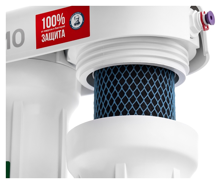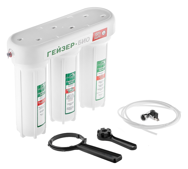 Фильтр ГЕЙЗЕР Био 321 предназначен для доочистки водопроводной воды от примесей, таких как железо, бактерии, хлорорганические и органические примеси, хлор, тяжелые металлы и механические частицы. Модель выполнена из пищевого пластика, допущенного к контакту с питьевой водой. Кран в комплект поставки не входит и приобретается отдельно. Этапы очистки воды: