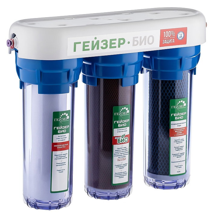 Фильтр ГЕЙЗЕР Био 322 предназначен для доочистки водопроводной воды от примесей, таких как железо, бактерии, хлорорганические и органические примеси, хлор, тяжелые металлы и механические частицы. Модель выполнена из прозрачного пищевого пластика, допущенного к контакту с питьевой водой. Этапы очистки воды: