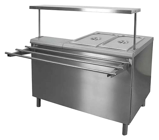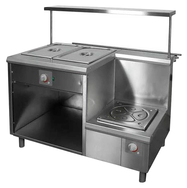 Комбинированный мармит Проммаш МЭК-1 предназначен для поддержания в горячем состоянии первых блюд в наплитной посуде и гастроемкостей со вторыми блюдами, гарнирами и соусами на предприятиях общественного питания и торговли. Модель оснащена 1 конфоркой, ванной, заполняемой водой и нагреваемой ТЭНами, расположенными под дном ванны, направляющими для подносов и полкой. Оборудование выполнено из нержавеющей стали. В комплект поставки входят 2 емкости GN. Дополнительные характеристики: