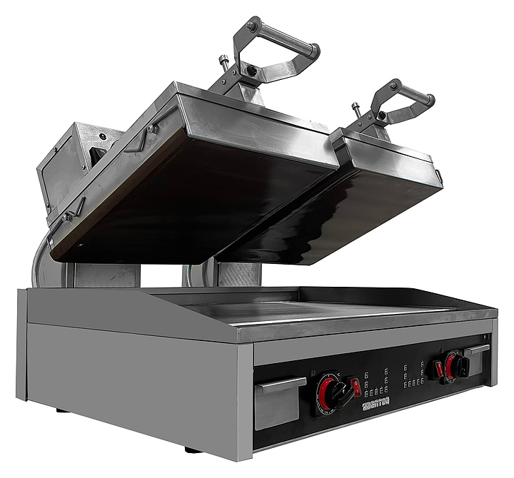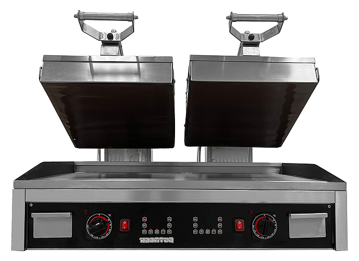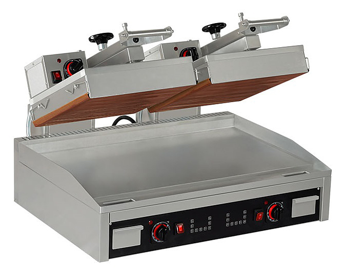Гриль пресс Kocateq GH66ED класса heavy-duty предназначен для жарки стейков мяса, птицы, рыбы и овощей, приготовления стейков, гамбургеров и горячих сэндвичей на предприятий fast-food, общественного питания и торговли. Модель оснащена цифровой панелью управления и термостатами для регулировки температуры. Верхние пластины покрыты сменной тефлонированной стеклотканью, нижняя пластина - из теплопроводящего сплава, корпус - из нержавеющей стали, ножки - из пластика. Особенности: