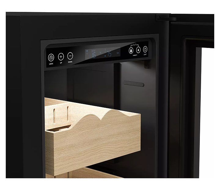 Сигарный шкаф Libhof BR-300 предназначен для хранения в оптимальных условиях и демонстрации табачных изделий в специализированных магазинах, гостиницах, складских помещениях, а также домашних условиях. Модель оснащена сенсорной панелью управления с дисплеем, распашной дверью и вентилятором. Корпус выполнен из металла, дверь - из антиультрафиолетового стеклопакета дымчатого цвета, полки - из натурального испанского кедра. В комплект поставки входят 3 телескопические полки, резервуар для воды, погружной увлажнитель и комплект ключей замка. Особенности: