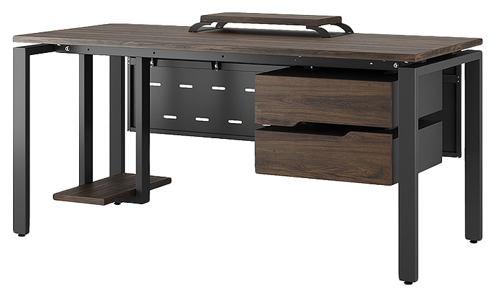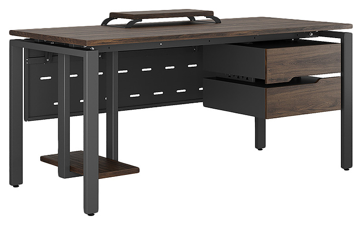 Компьютерный стол Кобор KP-140/60 black/charlston используется в офисных помещениях и кабинетах руководителей. Модель оснащена П-образными опорами. Каркас выполнен из металла, выкрашенного в цвет черный муар (RAL9005), столешница – из ламинированной древесно-стружечной плиты (ЛДСП) цвета дуб чарльстон (H3154 ST36). Опции (заказываются отдельно):