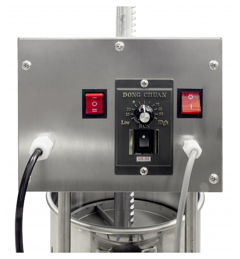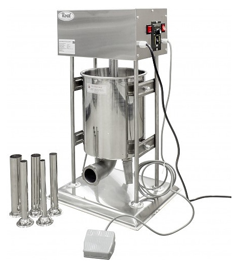 Колбасный шприц Roal Meat DD15L используется на предприятиях пищевой промышленности при производстве колбасных изделий и аналогичных продуктов для наполнения начинкой подготовленных оболочек. Модель оснащена электромеханической панелью управления. Корпус и насадки выполнены из высококачественной нержавеющей стали. В комплект поставки входят ножная педаль и 5 сменных насадок различного диаметра. Особенности: