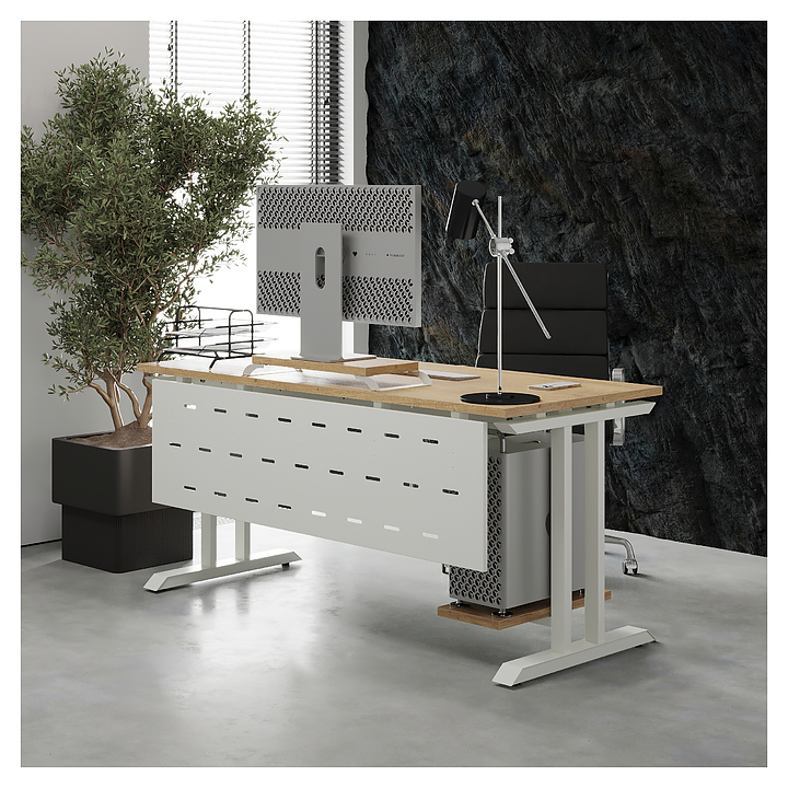 Компьютерный стол Кобор KT-120/80 white/natural используется в офисных помещениях и кабинетах руководителей. Модель оснащена T-образными опорами. Каркас выполнен из металла, выкрашенного в цвет белый муар (RAL9016), столешница – из ламинированной древесно-стружечной плиты (ЛДСП) цвета натуральный дуб (H1180 ST37). Опции (заказываются отдельно):