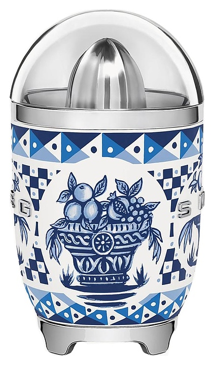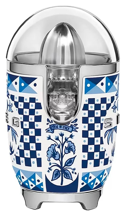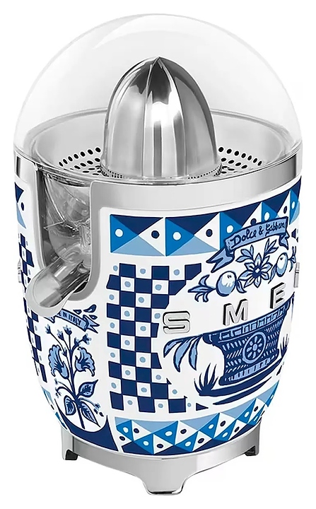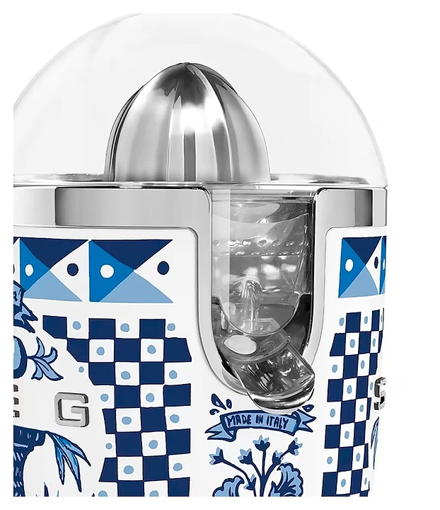 Соковыжималка SMEG CJF01DGBEU предназначена для приготовления свежих соков из различных цитрусовых фруктов в гостиницах, офисах и домашних условиях. Модель оснащена кабелем питания с евровилкой. Корпус обтекаемой формы выполнен из литого алюминия с глянцевой поверхностью, вдохновленными культурой Средиземноморья декоративными рисунками и паттернами в комбинации белого и синего тонов, крышка и чаша для сока – из высокопрочного полимера Tritan Renew без содержания вредных компонентов, основание – из пластика с поверхностью цвета полированный хром, носик, фильтр и конус – из нержавеющей стали, объемные накладные литеры логотипа с серебристой поверхностью. Комплектация: