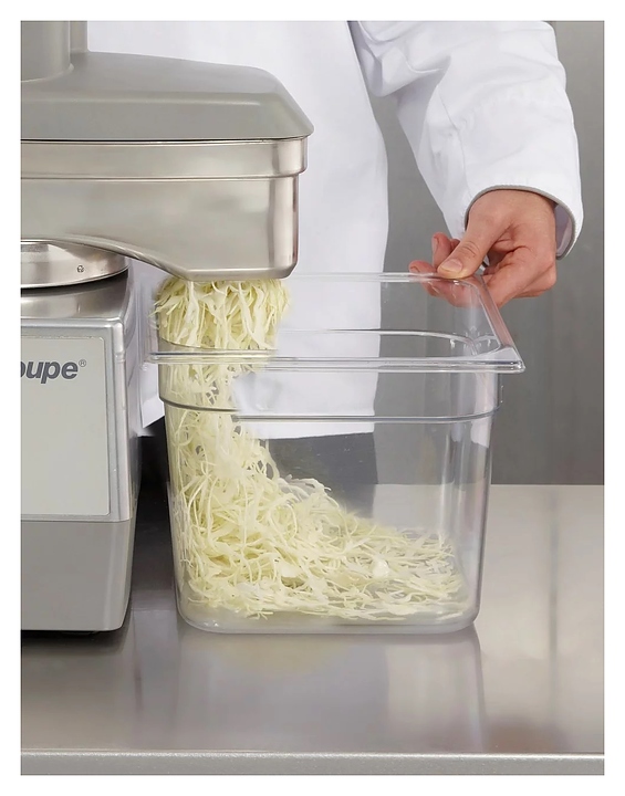 Овощерезка Robot Coupe CL40 используется на предприятиях общественного питания и торговли для нарезки овощей, фруктов, грибов, твердого сыра и колбас и дальнейшего использования их в качестве ингредиентов для приготовления супов, салатов, гарниров и пр. Модель оснащена 2 загрузочными отверстиями: большой D-образной воронкой для нарезки объёмных овощей (вмещает до 7 помидоров) и круглой - для длинных и нежных. В комплект поставки входит аксессуар для безопасной и бережной очистки решеток D-Clean Kit и набор из 6 дисков 1945. Особенности:
