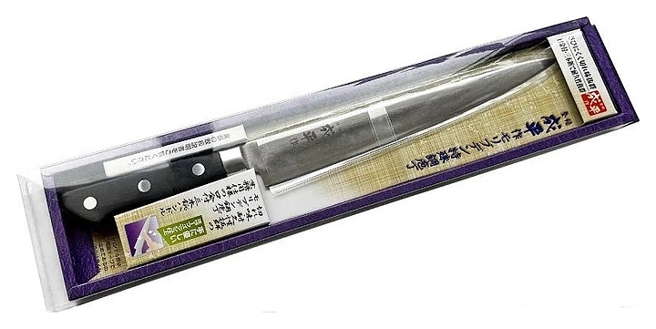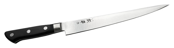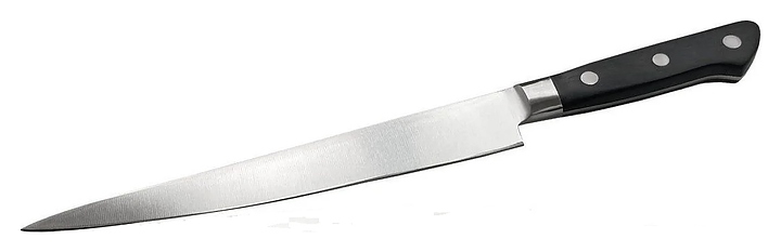 Поварской нож-слайсер Fuji Cutlery FC-1043 серии Reigetsu используется на предприятиях общественного питания и в домашних условиях для нарезки колбасы, сыра и других продуктов на аккуратные ломтики. Модель оснащена узким однослойным лезвием и тонким клиновидным острием. Изделие не рекомендуется мыть в посудомоечной машине. Клинок выполнен из высококачественной нержавеющей стали марки Mo-V с содержанием молибдена и ванадия, рукоятка – из АБС-пластика черного цвета. Особенности: