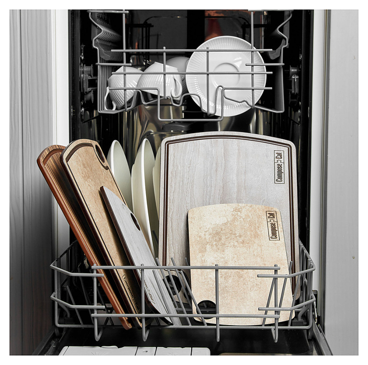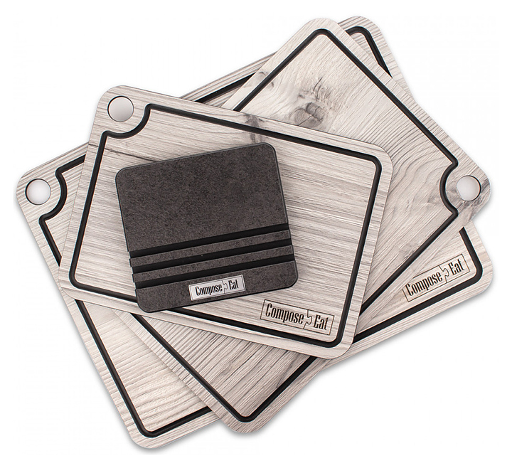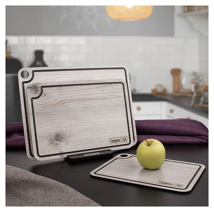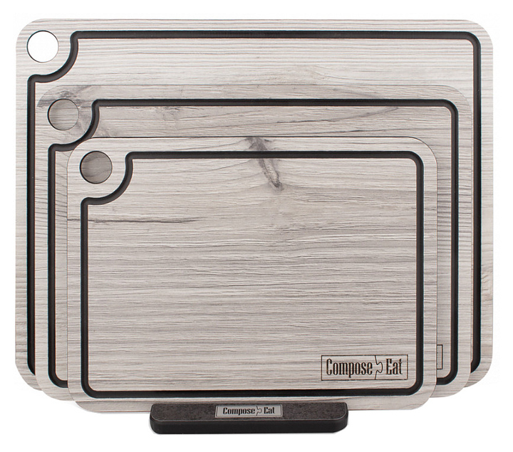 Набор разделочных досок ComposeEat Elegance NRD32058ОА4 состоит из 3-х досок различного размера и подставки, выполнен из бумажного композитного материала, сохраняющего целостность при падении, ударах и механической нагрузке, устойчивого к резким перепадам температур, не подверженному деформации, выцветанию, сколам, трещинам и механическим повреждениям. Изделия оснащены желобом для слива жидкости и отверстием для подвешивания. Особенности:
