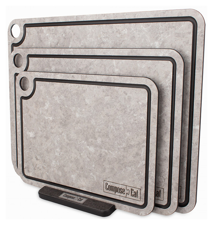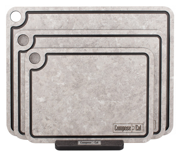Набор разделочных досок ComposeEat Elegance NRD34057ОА4 состоит из 3-х досок различного размера и подставки, выполнен из бумажного композитного материала, сохраняющего целостность при падении, ударах и механической нагрузке, устойчивого к резким перепадам температур, не подверженному деформации, выцветанию, сколам, трещинам и механическим повреждениям. Изделия оснащены желобом для слива жидкости и отверстием для подвешивания. Особенности: