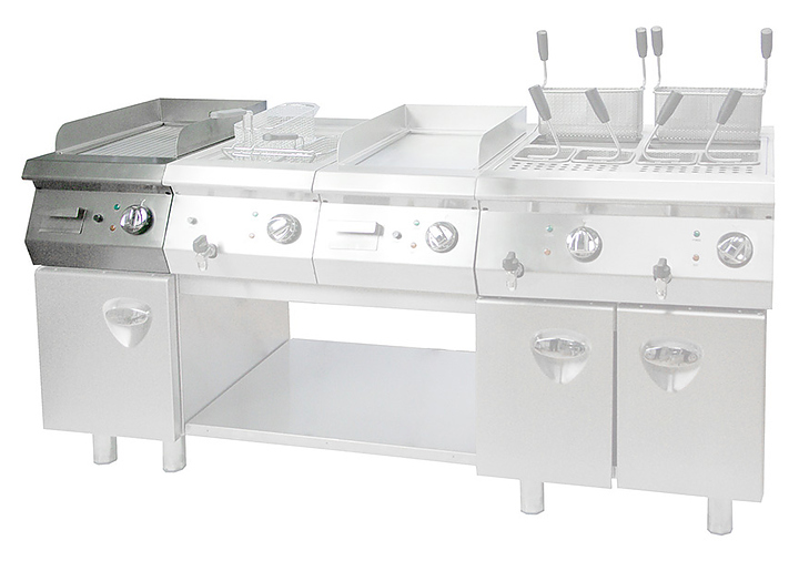 Гриль-сковорода Kocateq 0M0FT2E предназначена для приготовления жареных мясных блюд, яичницы, жареной рыбы, оладьев, котлет и гамбургеров на предприятиях общественного питания и торговли. Модель оснащена механическим термостатом для регулировки температуры и защитным термостатом, автоматически отключающим напряжение при повреждении основного термостата. Ребристая поверхность выполнена из сплава чугуна FE510D толщиной 16 мм, декоративные ручки с накладками - из зеркально полированной нержавеющей стали, поверхности, соприкасающиеся с продуктами, - из нержавеющей стали AISI 304 толщиной 1 мм, дно и задняя стенка - из нержавеющей стали AISI 201 толщиной 1 мм. Особенности: