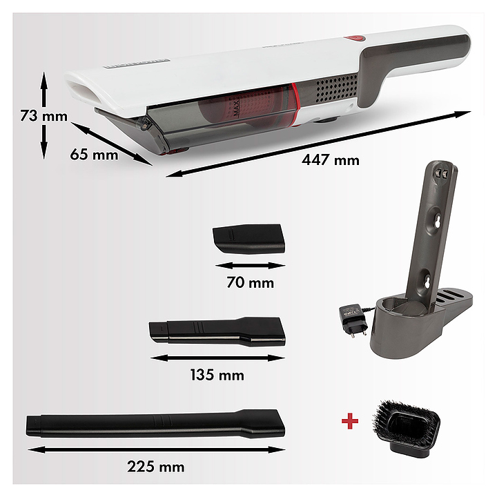 Аккумуляторный ручной пылесос ProfiCare PC-AKS 3102 weiss предназначен для уборки крошек, пыли, волос с полов, ковров, мягкой мебели и других поверхностей в частных домах, квартирах, отелях и офисах, а также подходит для уборки в автомобиле. Модель оснащена фильтром грубой очистки и настенным креплением с функцией зарядки. В комплект поставки входят 3 щелевые насадки различной длины, насадка-щетка и держатель. Особенности: