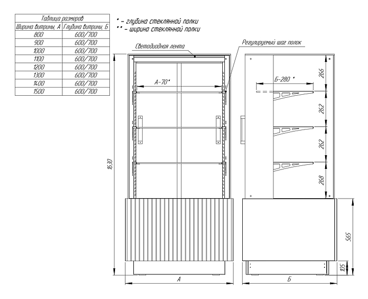 Напольная кондитерская витрина Finist AIR LUX AL-8-7-163 предназначена для кратковременного хранения и предпродажной демонстрации десертов и кондитерских изделий на предприятиях общественного питания и торговли. Модель оснащена раздвижными дверьми-купе, 3 полками и подсветкой. Фасады выполнены из МДФ, полки - из стекла, дно витрины - из зеркальной нержавеющей стали. Особенности: