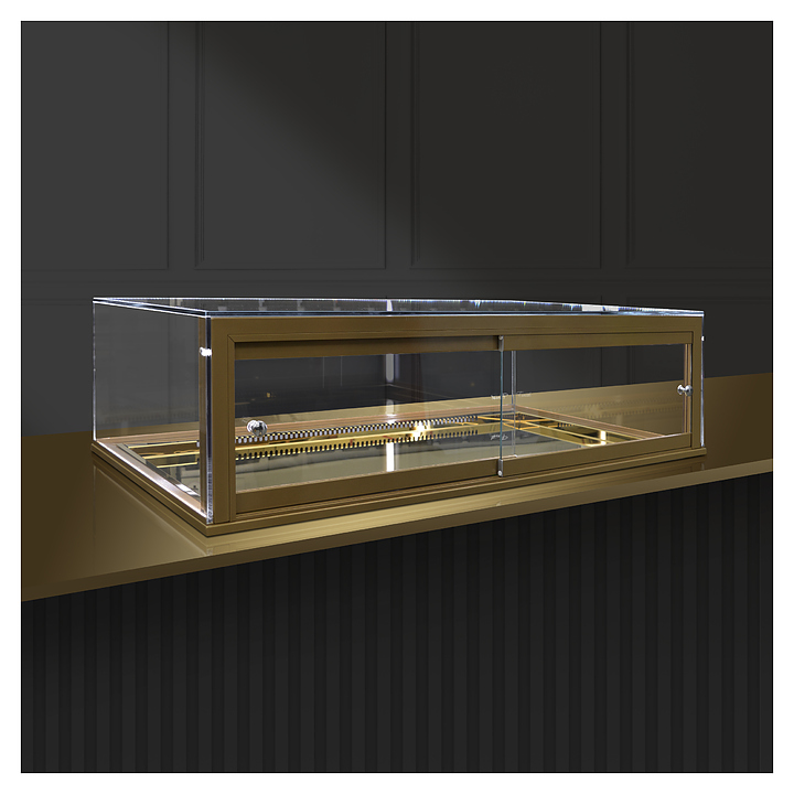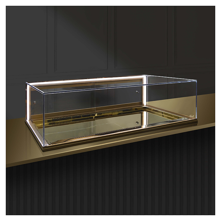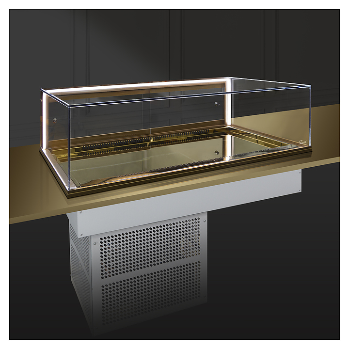 Встраиваемая кондитерская витрина Finist Glassier58 Gold Gg-13/55/3 предназначена для кратковременного хранения и предпродажной демонстрации десертов и кондитерских изделий на предприятиях общественного питания и торговли. Модель может монтироваться в столешницу из любого материала, что позволяет легко интегрировать в интерьер. Витрина оснащена светодиодной подсветкой и дверцей-купе. Каркас выполнен из зеркальной нержавеющей стали, купол - из стекла, поддон - с покрытием из нитрида титана, агрегатная часть - из крашеной стали. Особенности: