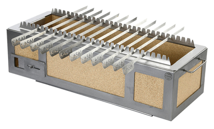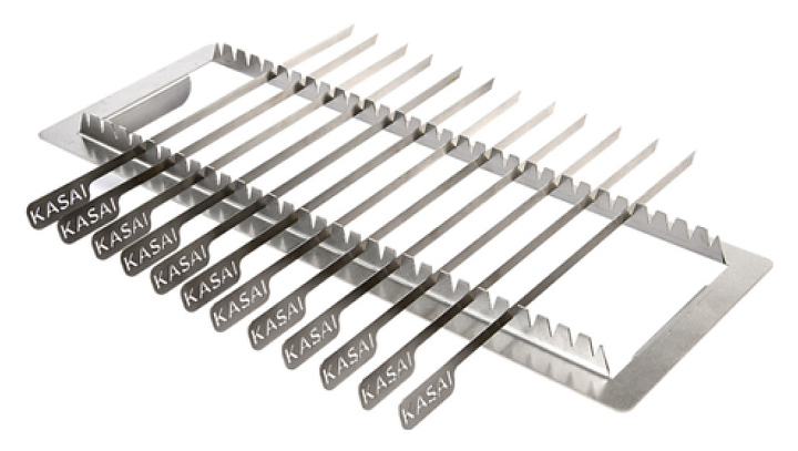Подставка для шампуров Kasai используется совместно с японским грилем Long Konro для приготовления блюд на древесном угле в частных домах и на предприятиях общественного питания. Изделие выполнено из нержавеющей стали. В комплект поставки входит 12 шампуров. Особенности: