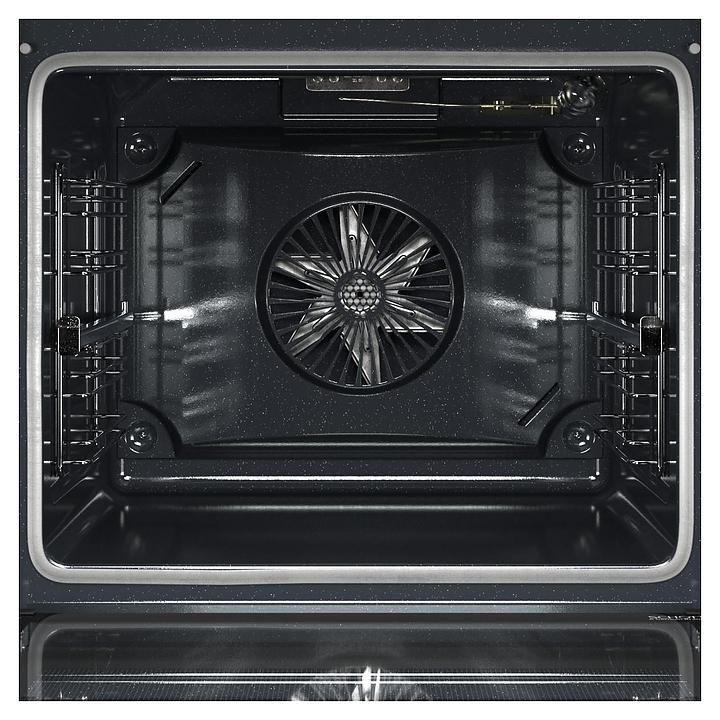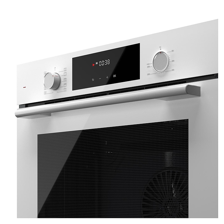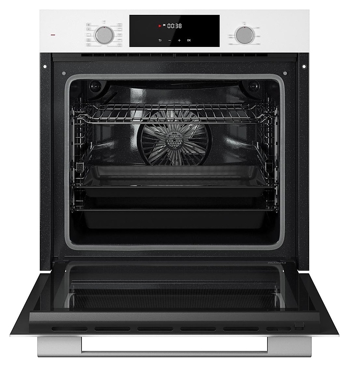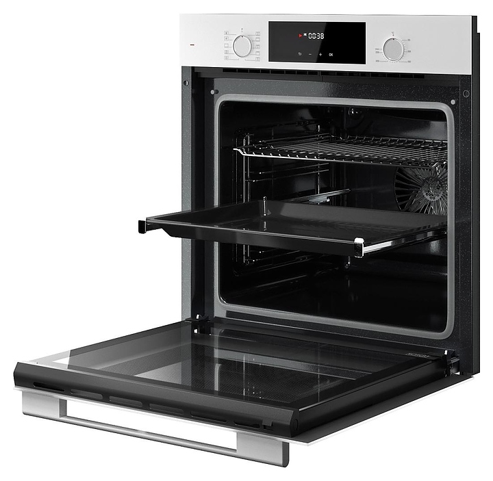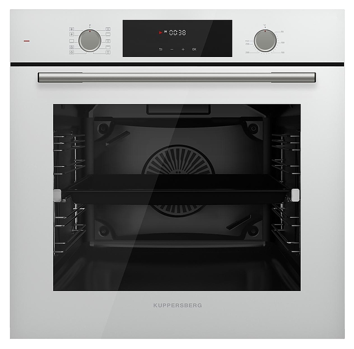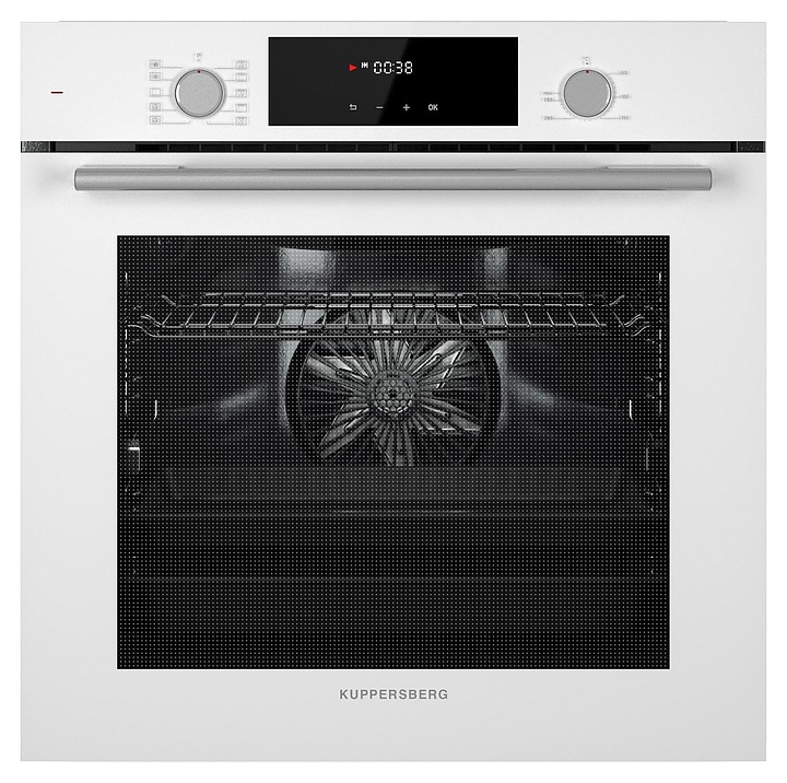 Электрический духовой шкаф Kuppersberg HF 609 W предназначен для приготовления большого ассортимента блюд в домашних условиях. Модель оснащена камерой с расположенными в задней стенке вентилятором и кольцевым нагревательным элементом, верхним и нижним нагревательными элементами, верхним грилем, 2 боковыми стойками с 5 уровнями направляющих для противней, откидной дверью со смотровым окном и уплощенной горизонтальной рукояткой, кабелем питания, электромеханической панелью управления с 2 цилиндрическими поворотными переключателями, функциональными сенсорными клавишами и светодиодным дисплеем с белой подсветкой индикации. Корпус выполнен из высококачественной стали, верхняя панель и дверь белого цвета с полным фронтальным остеклением без винтового крепежа, боковые стойки, направляющие и решетка для гриля с хромированным покрытием, противни – из металла с эмалированным покрытием, рукоятка с серебристой поверхностью. В комплект поставки входят решетка для гриля, 2 противня: стандартный и глубокий, инструкция по эксплуатации и гарантийный талон. Особенности: