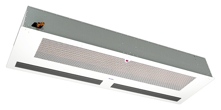 Воздушная завеса Тепломаш КЭВ-98П4191W серии 400 Потолочная предназначена для защиты от внешнего притока холодного или теплого воздуха, пыли, насекомых и неприятных запахов путем установки в дверных проемах жилых, торговых и административных помещений, гостиниц, медицинских и общеобразовательных учреждений. Модель оснащена 2 блоками диаметральных (тангенциальных) вентиляторов с электродвигателем, водяным теплообменником, воздухозаборной и воздуховыпускной решетками на лицевой панели. Корпус выполнен из оцинкованной стали, лицевая панель – из стали с антикоррозийным покрытием порошковой краской светло-серого оттенка (RAL 7035), теплообменник – из медных трубок и алюминиевых ламелей, корпусы пульта и выносной панели – из ударопрочного белого пластика.