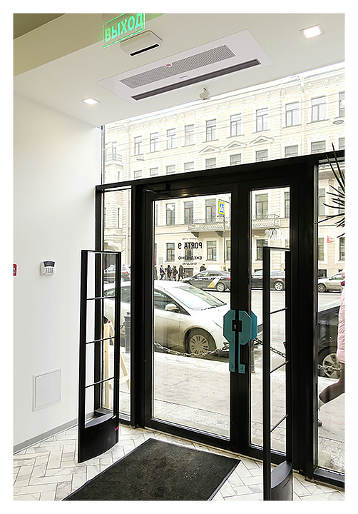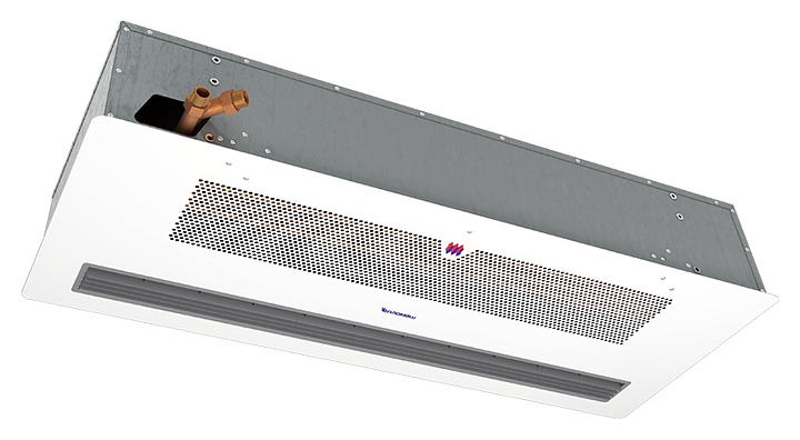 Воздушная завеса Тепломаш КЭВ-20П2171W серии 200 Потолочная предназначена для защиты от внешнего притока холодного или теплого воздуха, пыли, насекомых и неприятных запахов путем установки в дверных проемах жилых, торговых и административных помещений, гостиниц, медицинских и общеобразовательных учреждений. Модель оснащена блоком диаметральных (тангенциальных) вентиляторов с электродвигателем, водяным теплообменником, воздухозаборной и воздуховыпускной решетками на лицевой панели. Корпус выполнен из оцинкованной стали, лицевая панель – из стали с антикоррозийным покрытием порошковой краской светло-серого оттенка (RAL 7035), теплообменник – из медных трубок и алюминиевых ламелей, корпусы пульта и выносной панели – из ударопрочного белого пластика. Для регулирования температуры необходимо подключить прибор к системе подачи теплоносителя с установленными циркуляционным насосом и клапаном с электроприводом. Комплектация: