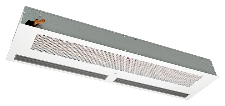 Воздушная завеса Тепломаш КЭВ-60П3191W серии 300 Потолочная предназначена для защиты от внешнего притока холодного или теплого воздуха, пыли, насекомых и неприятных запахов путем установки в дверных проемах жилых, торговых и административных помещений, гостиниц, медицинских и общеобразовательных учреждений. Модель оснащена 2 блоками диаметральных (тангенциальных) вентиляторов с электродвигателем, водяным теплообменником, воздухозаборной и воздуховыпускной решетками на лицевой панели. Корпус выполнен из оцинкованной стали, лицевая панель – из стали с антикоррозийным покрытием порошковой краской светло-серого оттенка (RAL 7035), теплообменник – из медных трубок и алюминиевых ламелей, корпусы пульта и выносной панели – из ударопрочного белого пластика.