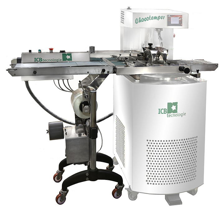 Глазировочный конвейер ICB tecnlologie s.r.l. 14.1.EB используется с темпером Chocotemper 24. Модель состоит из расширяющейся ленты с 3 секциями и регулируемой скоростью. На первой секции пользователь размещает продукт и включает конвейер, далее продукция поступает на большой конвейер в зону глазирования. В зоне обдува с продукции сверху снимается лишняя глазурь. Частота вращения вентилятора изменяет количество глазури, остающейся на поверхности изделий. По окончании обдува продукция проходит два сглаживающих вала для снятия лишней глазури снизу и одновременного заглаживания нижней части продукции, далее изделия поступают на охлаждение. Характеристики: