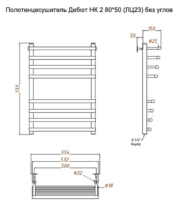 Полотенцесушитель водяной Тругор Дебют НК 2 80х50 см (без углов), хром