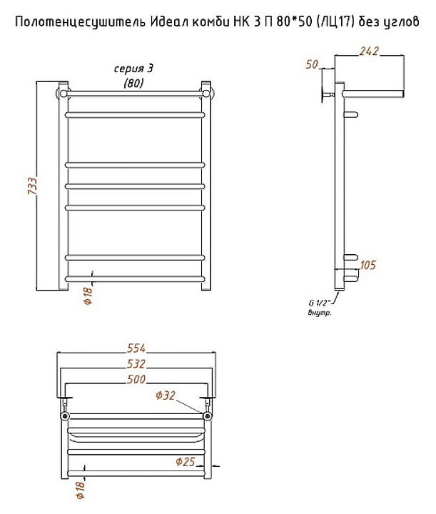 Полотенцесушитель водяной с полочкой Тругор Идеал комби НК 3 П 80х50 см (без углов), хром